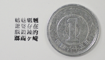 上が当店のゴム印、下が簡素に作成できる1工程で作成したゴム印の印影です。下のゴム印はゴムが薄く彫りも浅いため強く押すと文字の無い部分が汚れてしまいます。